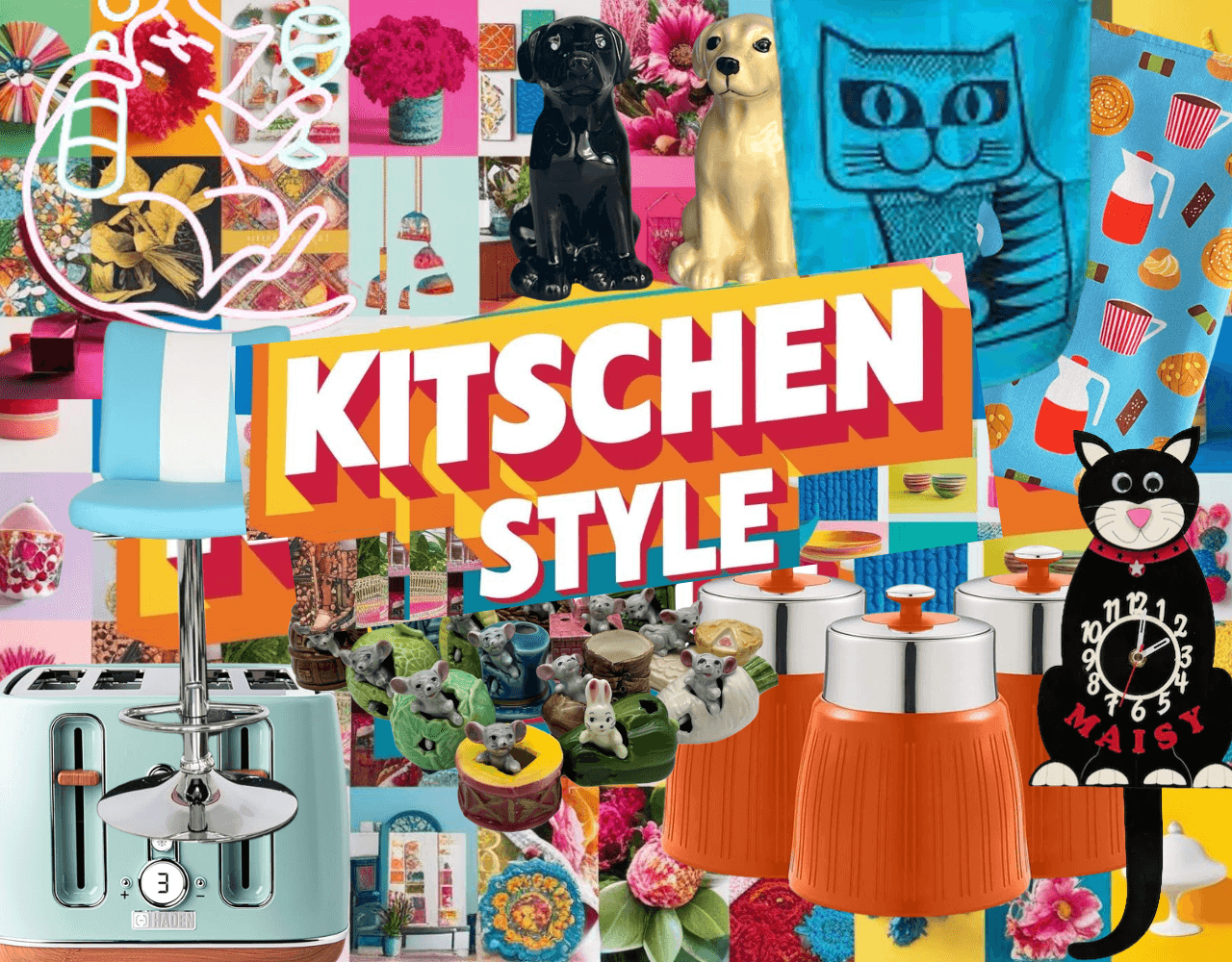 - Quirky Accessories: Kitschy decor like ceramic figurines, novelty salt-and-pepper shakers, colourful dishware, and retro signage (e.g., vintage advertisements or food-related puns) play a major role.